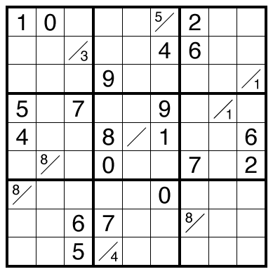 In this variation on both 0 to 9 Sudoku, some cells are filled with slashes and must contain two numbers with a smaller one over a larger one.