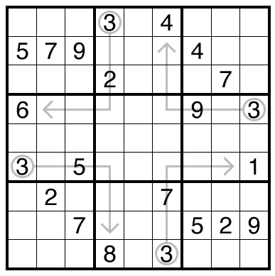 Unlike Arrow Sudoku, there are no sum constraints here; the arrows tell you how many different numbers appear on the path. By Bill Murphy