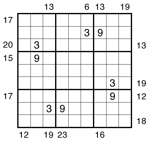 Can you figure out the glue for this puzzle (the three number sums from the outside frame clues) to get enough going to complete the grid?