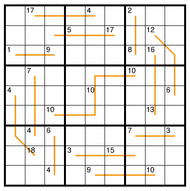 This Killer Sudoku variation requires you to split the lines into subsections to get the "cages" you would typically need to solve the grid.