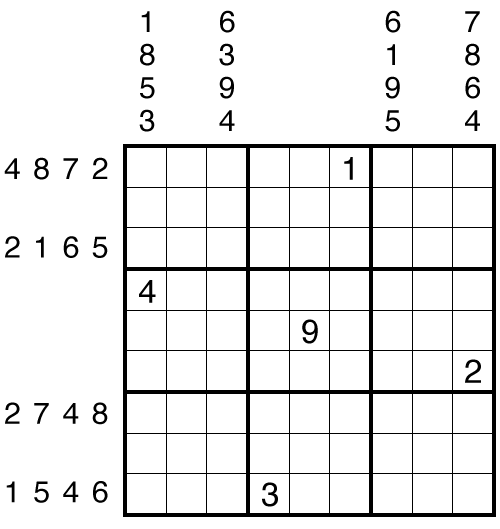 As a kind of variant of Outside Sudoku, in this puzzle there are strings of connected numbers that must be placed into the grid all at once.