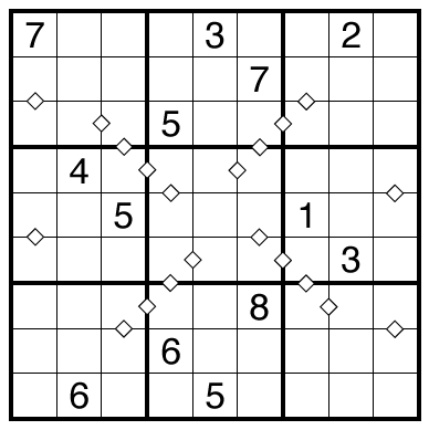 In this Sum Nine Sudoku, some pairs of cells that sum to nine are marked with diamonds. Can you find your way to the one solution?