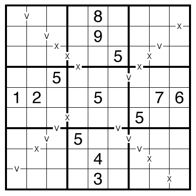 This XV Pairs Sudoku by Philip Newman almost has its own X shape made out of the adjacent cell clues. Can you solve it?